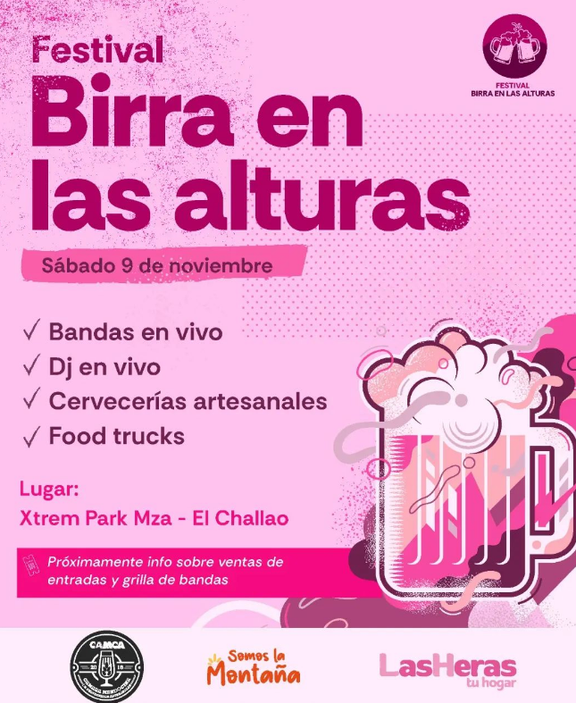 El sábado 9 de noviembre desde las 18 horas hasta la 1 de la mañana inclusive, la Cámara Mendocina de Cerveceros Artesanales (CAMCA) –camca_mza – realizará la 1° edición del Festival “Birra en las Alturas”. Será en Xtrem Park Mza – El Challao y la entrada costará $ 5000.