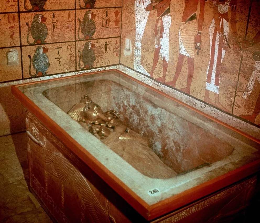 Encontraron también otra puerta sellada, flanqueada por dos estatuas de Tutankamón, que llevaba a la cámara del sarcófago. Todo estaba intacto, salvo por las consecuencias del paso del tiempo. En miles de años nadie había entrado a esa tumba.