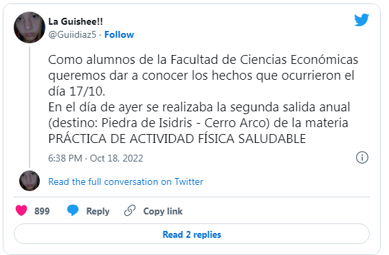 Según manifestó una estudiante que prefiere mantenerse en el anonimato, el horario de finalización de la salida era a las 17:30 horas. «Nos da bronca que digan que la actividad se realizó con normalidad ya que no fue así. Mientras caminábamos por el cerro teníamos miedo porque habían muchos truenos y lluvia», explicó.