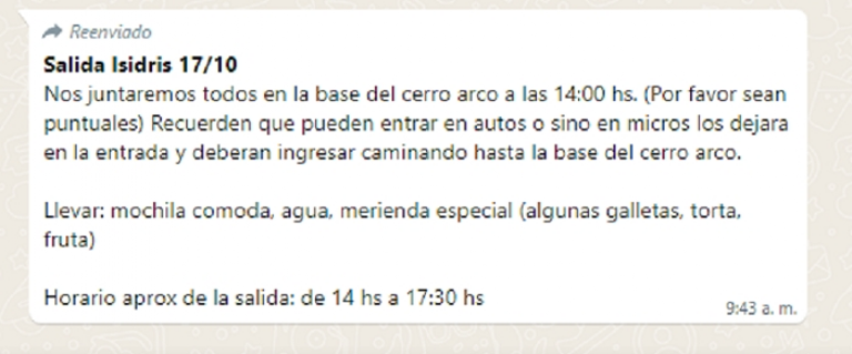 Nunca llegamos a destino porque pasados los 20 minutos empezó a lloviznar y no íbamos a seguir caminando por la lluvia. Entre los chicos que empezaron a ver que habían truenos y lluvias, los chicos les decían a los profes que suspendieran la actividad. En un momento nos juntaron a todos y nos preguntaron ¿chicos qué hacemos, seguimos o nos vamos? y decidimos irnos», expresó otra de las estudiantes.