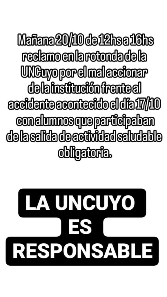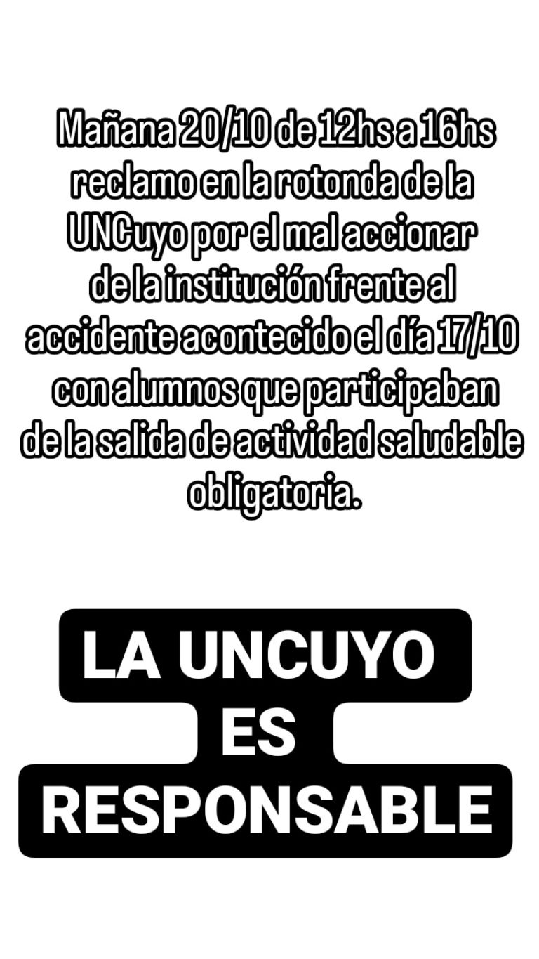 El accidente protagonizado por estudiantes de UNCuyo a metros del ingreso al Cerro Arco dejó como saldo el fallecimiento de una estudiante de 20 años, otra joven que permanece internada en cuidados intensivos en grave estado y 16 heridos que fueron ingresados en distintos hospitales de la provincia de Mendoza. Tras conocer la versión oficial de la alta casa de estudios, los estudiantes desmintieron los dichos de los funcionarios y expresaron su repudio en redes sociales.