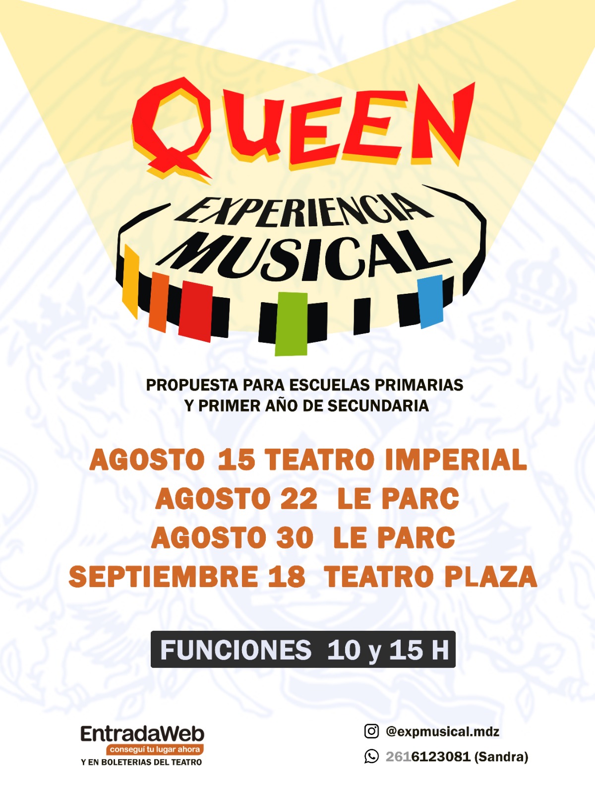 Experiencia Musical (expmusical.mdz), la banda integrada por Andrés González (cantante), Lara Barreiro (cantante), Gastón Sáez (tecladista), Luca Moscetta Rubio (bajista), Silvina Inés Ormeño (baterista) y Nazareno Tondini (guitarrista); protagonizó esta original modalidad educativa, que alternó canciones de Queen, con explicaciones sobre elementos claves del lenguaje musical y ejecución de los instrumentos.