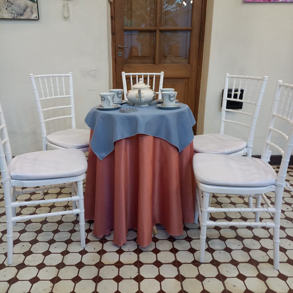 El lugar está ambientado para vivir la obra «Amigas desgraciadas» escrita por Hugo Marcos y dirigida por Facundo Fozco. Nos encontramos frente a nosotros con una coqueta mesa lista para tomar el té, cartas y cinco sillas blancas donde cinco amigas vivirán una noche distinta a todas y muy cerquita del público, haciéndonos cómplices de sus mentiras, verdades a medias y desgracias.