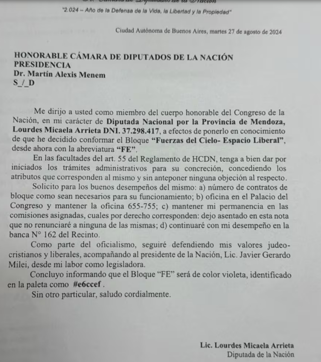Acto seguido, o antes, según quien cuenta la versión, una nota firmada por Arrieta da cuenta de la salida y del nuevo bloque que arma. “Fuerzas del Cielo – Espacio Liberal” que se reduce a la sigla “FE”. “Acabo de presentar una nota en la que informo que armo mi propio bloque”, dijo Arrieta a la prensa.