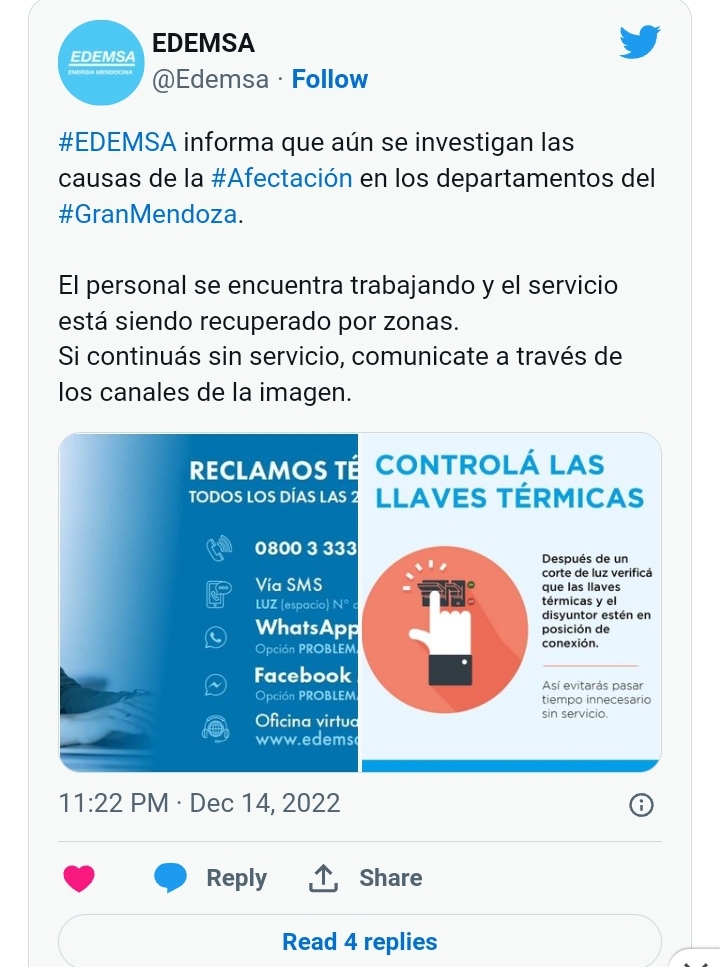 Por su parte, desde Edemsa informaron que «hubo una falla en la doble terna que une la central de Luján con la de la capital de Mendoza», en relación al motivo del corte de luz, y agregaron que «las guardias están trabajando en la solución del problema»: