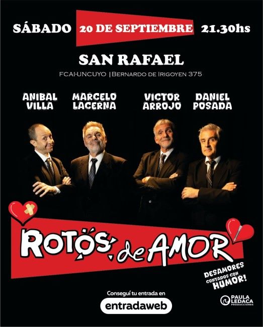 Víctor Arrojo (arrojovictor), Marcelo Lacerna (marcelolacerna), Daniel Posada (danielposada65) y Aníbal Villa (anibaljaviervilla) continúan celebrando los 15 años ininterrumpidos de la obra “Rotos de Amor”. Un verdadero éxito de la cartelera local que desembarcará el sábado 20 de septiembre en San Rafael para ofrecer una función especial en el Aula Magna de la Facultad de Ciencias Aplicadas a la Industria (FCAI) (Bernardo de Irigoyen 375, San Rafael) a las 21:30 horas.