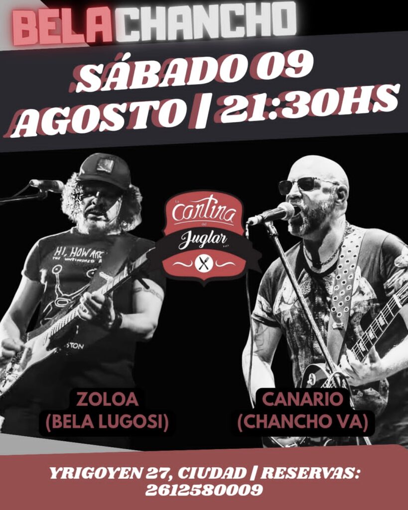 El sábado 9 de agosto a las 21:30 horas, el corazón de la Ciudad se convierte en el epicentro del rock con un cruce de caminos imperdible. Marcelo Zoloa (@marcezoloa) y Canario Vilariño (@yo_mutante), dos íconos del rock mendocino y regional, se reúnen en un formato íntimo, con invitados especiales, para recorrer lo mejor del repertorio de Bela Lugosi y Chancho Va.