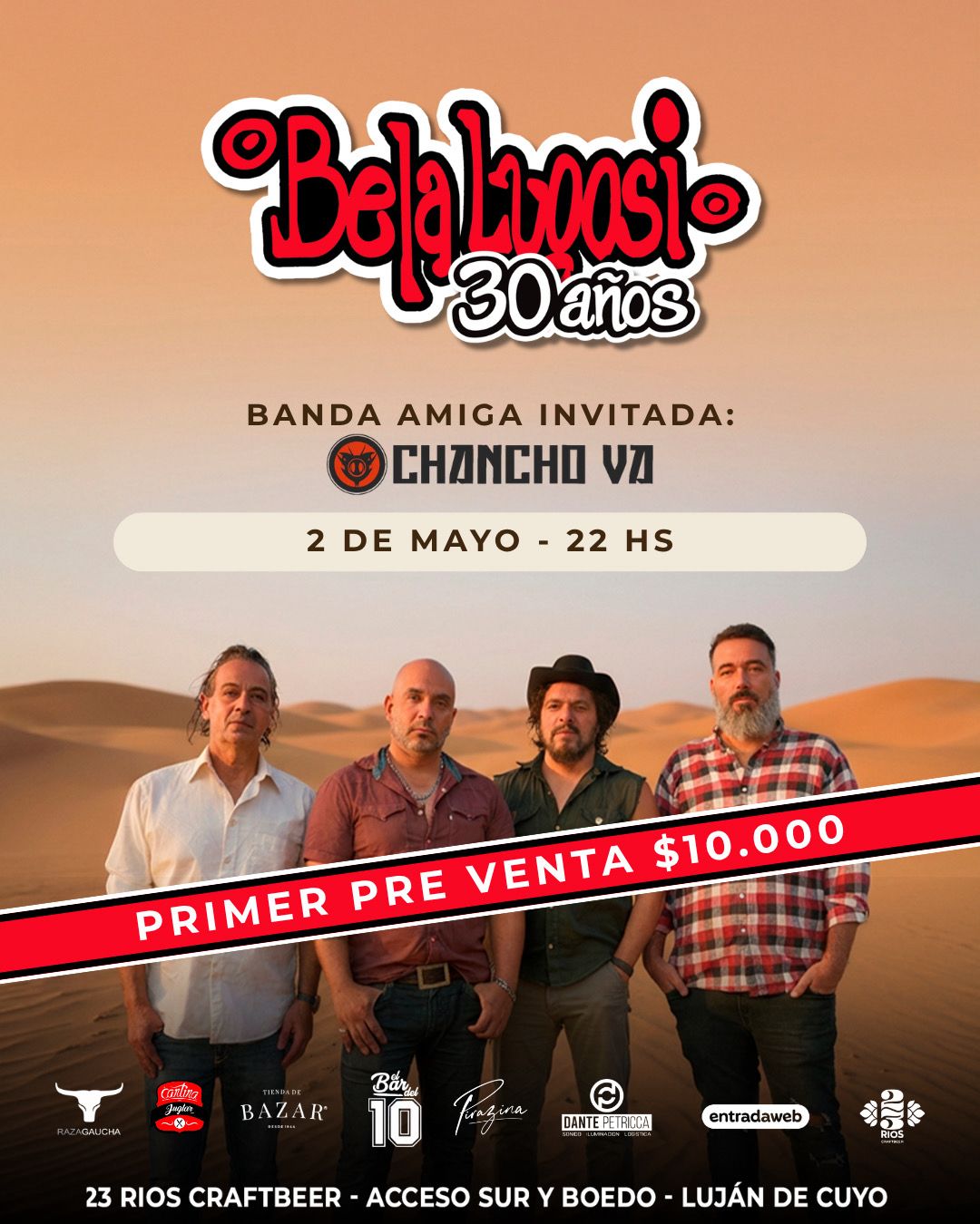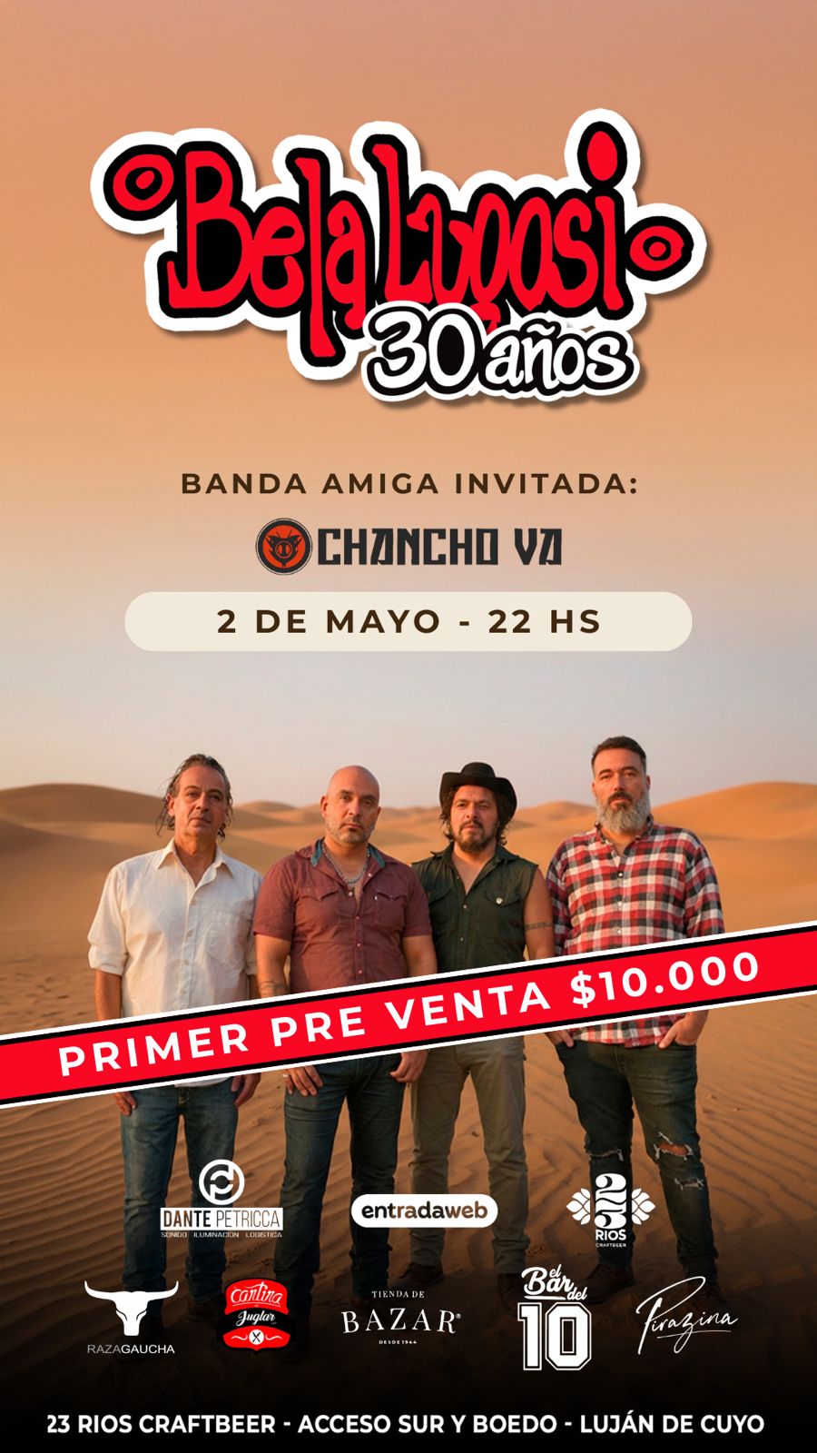 Bela Lugosi (losbela) celebra 30 años de trayectoria con un show especial el sábado 2 de mayo a las 22 horas en 23 Ríos (Acceso Sur y Boedo, Luján de Cuyo). Las entradas ya se encuentran disponibles a través de Entradaweb.com.ar con una primera preventa limitada a $10.000.
