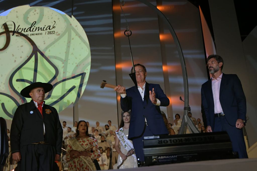 Espectáculo”Cosecha en un tiempo nuevo” ofreció un espectáculo que vinculó lo religioso, la cultura vitivinícola local y mucho folclore. Buscó reflejar el amor, el reencuentro, el brindis y la cosecha. Se apeló a poner en relieve la unidad y el agradecimiento con un pasaje referido al ser argentino también.En el inicio tuvo un capítulo especial para las mujeres con referencia a exponentes históricas de las luchas políticas.Estuvo bajo la dirección Artística General, idea y realización de Alejandro Scarpetta. Gloria Bratschi fue la responsable del guión y Mónica Pacheco, de la dirección musical general.Tuvo un protagonismo especial la actuación coral y así se anunció un nuevo año de Vendimia.Actores, bailarines folclóricos y contemporáneos le dieron vida a una celebración basada en la que, como es habitual, la música cumplió un rol fundamental de la mano de unos 150 coreutas y cerca de 30 músicos en vivo.Los orígenes de la Bendición de los FrutosLa vinculación entre la vitivinicultura local y el aspecto religioso, que se expresa en esta celebración, viene desde los comienzos del desarrollo de la actividad en la zona.La primera Bendición de los Frutos se realizó el 2 de abril de 1938, en la Rotonda de los Caballitos de Marly, oficiada por monseñor José Verdaguer y, tal como sucedió en esta oportunidad, el escenario elegido fue el Parque General San Martín.El golpe de reja se instituyó al año siguiente (1939).Recién en 1946, la Bendición de los Frutos comenzó a desarrollarse en el Prado Gaucho del Parque General San Martín.//