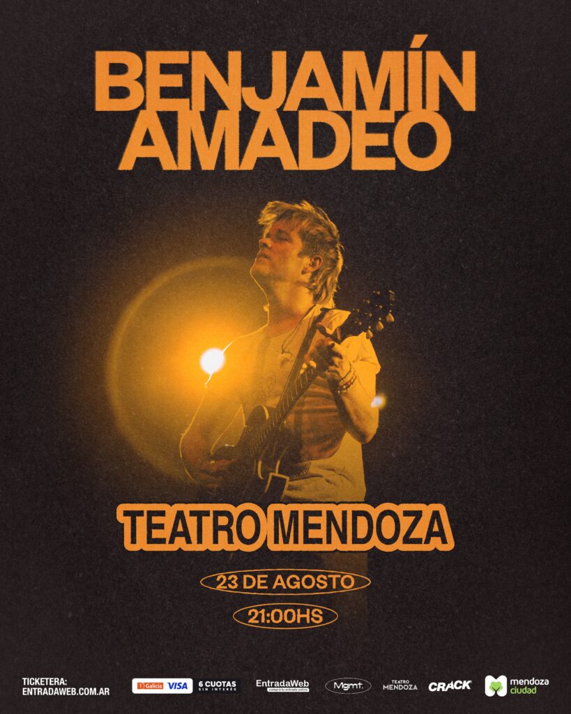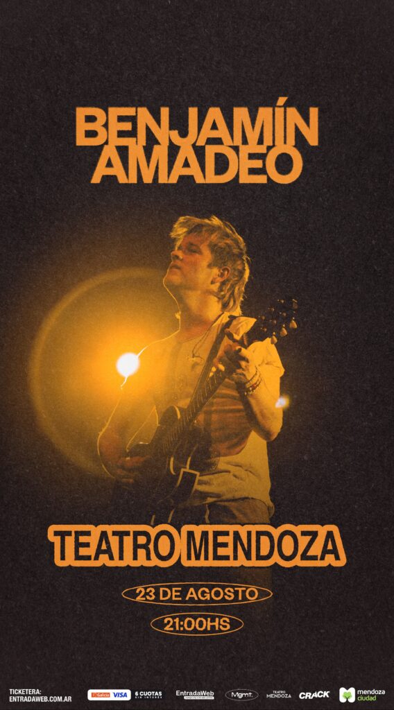 Benjamín Amadeo (benjamadeo) es uno de los destacados cantautores pop de esta generación. Con su Gira Salvadora regresa a la provincia y se presentará por primera vez en el teatro Mendoza, el sábado 23 de agosto. Las entradas están a la venta en Entradaweb.com.ar, promoción exclusiva clientes Visa Banco Galicia 6 cuotas sin interés.