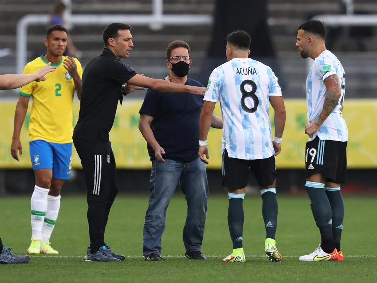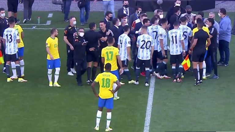 Cuando se llevaban jugados 5 minutos y 10 segundos del primer tiempo de Brasil-Argentina por Eliminatorias, ingresaron repentinamente, irrumpiendo, cuatro fiscales de Anvisa (Agencia Nacional de Vigilancia Sanitaria) y hombres de la policía (aparentemente armados) al campo de juego. Frenaron el partido y uno, con un acta en mano, quiso explicar que tres jugadores (Dibu Martínez, Cuti Romero y Lo Celso) no podían jugar y tenían que ser deportados junto con Buendía, que no fue al banco.