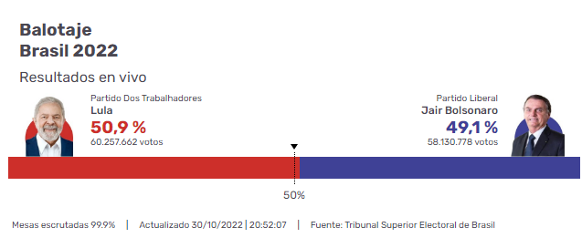 Lula da Silva será el nuevo presidente de Brasil ya que logró el 50,84% de los votos frente al 49,16% del actual presidente, Jair Bolsonaro, escrutado con el 99% de los votos . Unos 150 millones de personas estaban convocadas para participar de un balotaje histórico, marcado por el escándalo generado por operativos en las rutas que demoraron a votantes del líder opositor.