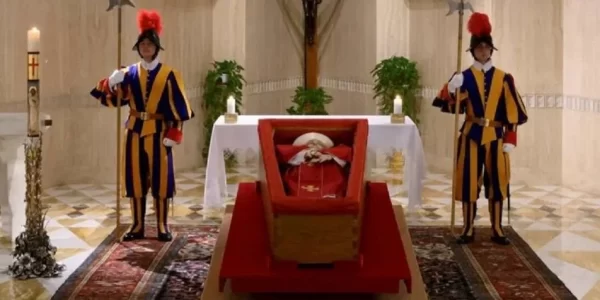 Papa Francisco: La Santa Sede difundió este martes las primeras imágenes del ataúd abierto del Sumo Pontífice expuesto en la Capilla de Santa Marta.