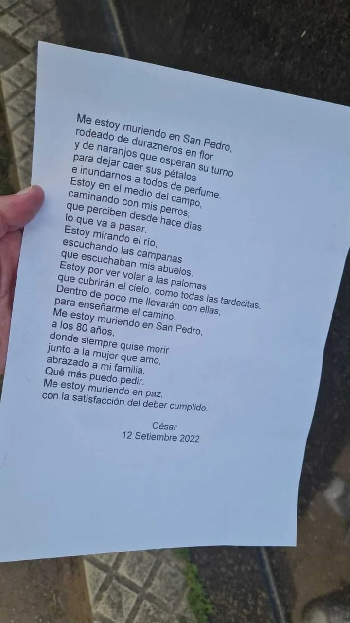 Luego, finaliza: “Me estoy muriendo en San Pedro a los 80 años, donde siempre quise morir, con la que amo, abrazado a mi familia. ¿Qué más puedo pedir? Me estoy muriendo en paz con la esterificación del deber cumplido”.