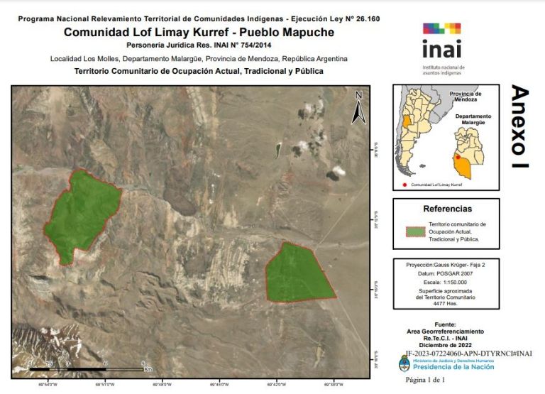 «Dése por cumplido el Relevamiento Técnico, Jurídico y Catastral dispuesto por el Artículo 3° de la Ley Nacional Nº 26.160, Decreto PEN N°1122/07 y la Resolución INAI N° 587/07 en la Comunidad Lof Limay Kurref, perteneciente al Pueblo Mapuche, con asiento en la provincia de Mendoza, con Personería Jurídica Nro. 754 del 06 de agosto de 2014 del Registro Nacional de Comunidades Indígenas Re.Na.C.I.», dice la resolución del INAI. «Reconócese la ocupación actual, tradicional y pública de la Comunidad Lof Limay Kurref, perteneciente al Pueblo Mapuche, con asiento en la provincia de Mendoza», agrega.