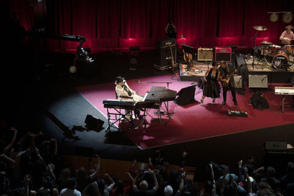 El comienzo del tercer concierto en el Centro Cultural Kirchner sorprendió a todos sus fans ni bien se levantó el telón. Allí estaba él, sentado a uno de los teclados, de traje blanco y sombrero negro para arremeter con “Cerca de la revolución”, según La Nación.