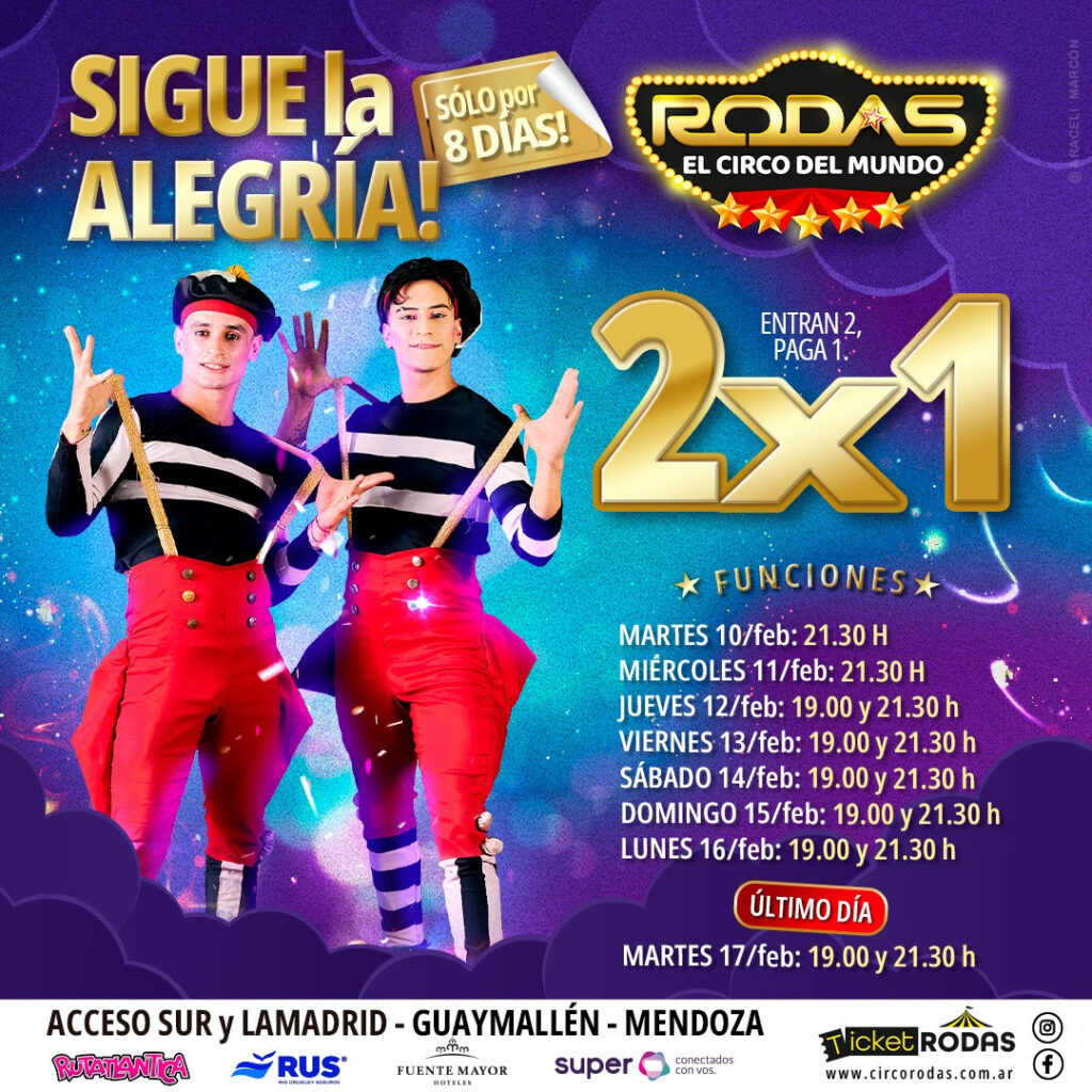 El Circo Rodas (circorodasoficial) atraviesa una temporada histórica en Mendoza y, debido al gran acompañamiento del público, anuncia la extensión de su estadía por ocho días más, con una promoción especial 2×1 en entradas, válida todos los días hasta el martes feriado 17 de febrero.