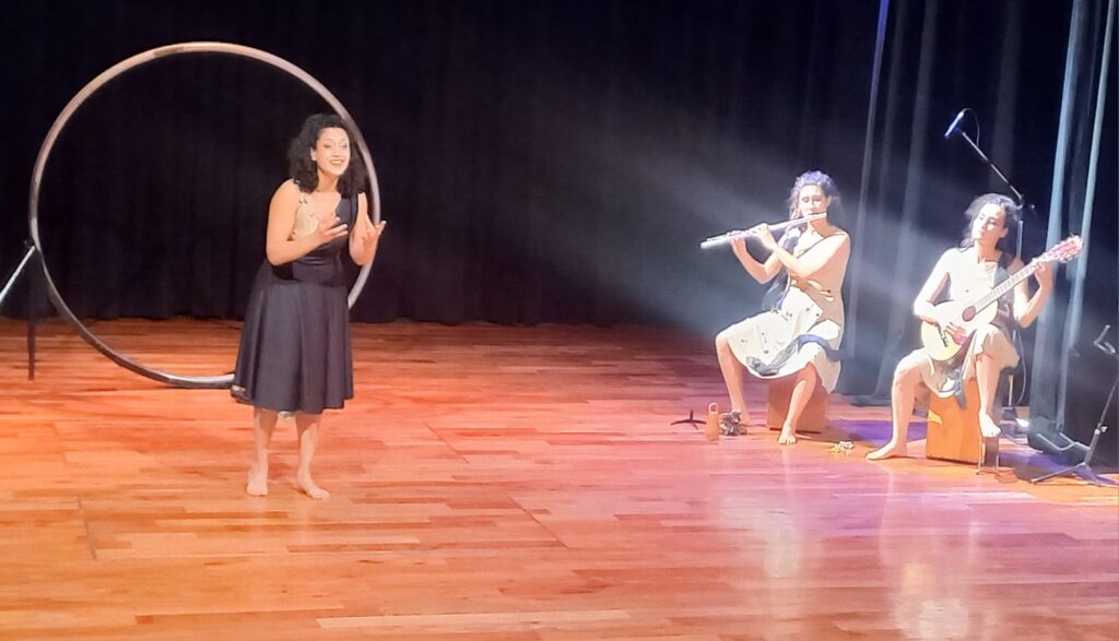 Carla Gisella Masignani, conocida como “Lolot Lanet” (lolotlanet) nos conquistó en Got Talent y nos sigue conquistando con el arte de las danzas acrobáticas y la rueda cyr luciéndose en la puesta de Claroscuro. Ella es una excelente actriz, bailarina, dramaturga y hasta productora de esta puesta tan linda… Y no está sola en escena, como dije antes hay dos vocecitas… grandes voces en realidad y músicas que la acompañan a la protagonista por su viaje interior hasta encontrar la luz… ellas son Melisa Budini ( @melibudini) y Eugenia Moreno (@negraeuge). Por último, pero para nada menos importante, encontramos en el trabajo de dirección, puesta en escena y de asistencia en la dramaturgia, a la hermosa Érica Gómez (@ericagomezlobos).