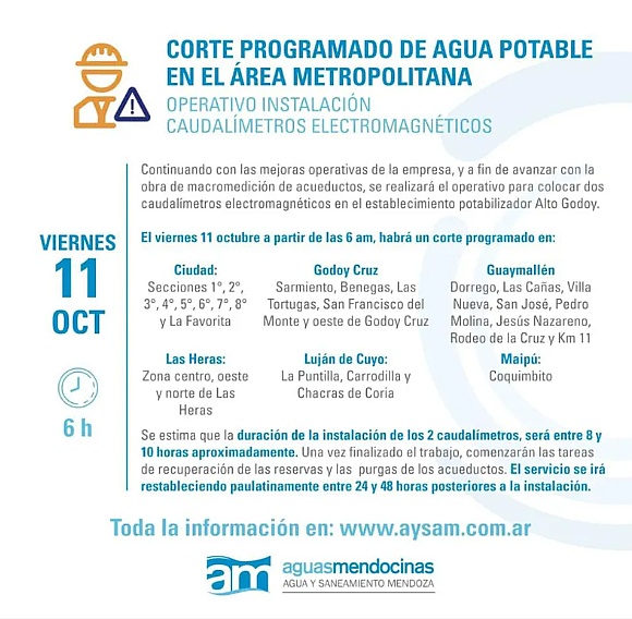 Desde Aguas Mendocinas informaron sobre un corte masivo del servicio que afectará a casi todo el Gran Mendoza. El próximo viernes 11 de octubre, a partir de las 6 de la mañana, se realizará un operativo para colocar dos caudalímetros electromagnéticos en los acueductos de acero de 750 mm y 900 mm de diámetro en el establecimiento potabilizador Alto Godoy.