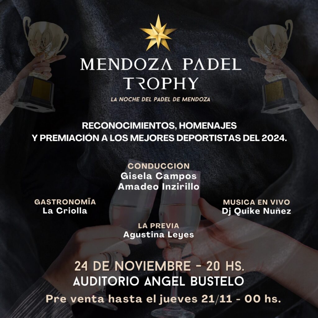 El Mendoza Padel Trophy 2024 (@mendozapadeltrophy) ya está en la cuenta regresiva y este domingo 24 de noviembre, en el Auditorio Ángel Bustelo, se distinguirá a los más destacados del año y además habrá un merecido reconocimiento a la trayectoria de verdaderas leyendas de esta disciplina.