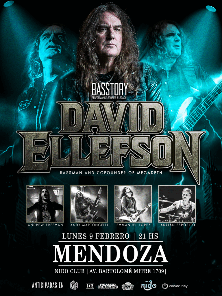 David Ellefson (davidellefsonbass), reconocido músico estadounidense, bajista y cofundador de la banda de thrash metal Megadeth anunció su gira latinoamericana 2026. Y llega a Mendoza por primera vez junto a su banda para presentar Basstory. El músico se presentará en una única función el lunes 12 de febrero, en Nido Club. Las entradas están disponibles en mianticipada.com.