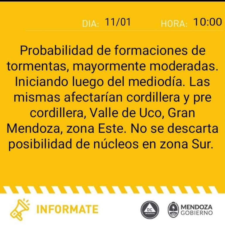 El comunicado de Defensa Civil expresa que hay probabilidad de formaciones de tormentas, mayormente moderadas que tendrán inicio luego del mediodía. «Las mismas afectarán cordillera y pre cordillera, Valle de Uco, zona Este y Gran Mendoza», destaca el comunicado.