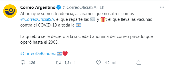 Tras conocerse la noticia el actual correo que todos conocemos como Correo Argentino, aclaró por twitter que nada tiene que ver con la empresa del Grupo Macri, sino que ellos son Correo Oficial S.A., correo de bandera, perteneciente al Estado que se encarga no sólo del correo y envíos de paquetes por el país, sino también del traslado de las vacunas contra el Covid-19.