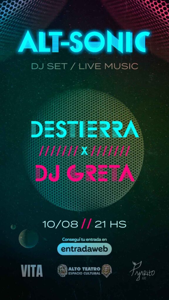 El sábado 10, desde las 21, se abren las puertas de Alto Teatro Espacio Cultural (alto_teatro) -Gral. Miller 153, Dorrego, Guaymallén- para un show que reúne la potencia de Destierra (destierra_) en vivo, presentando su álbum debut, y la energía que emana de las bandejas de DJ Greta (greta.dj) en su finísimo set rockero. Las entradas pueden conseguirse a través de Entradaweb, con capacidad limitada.