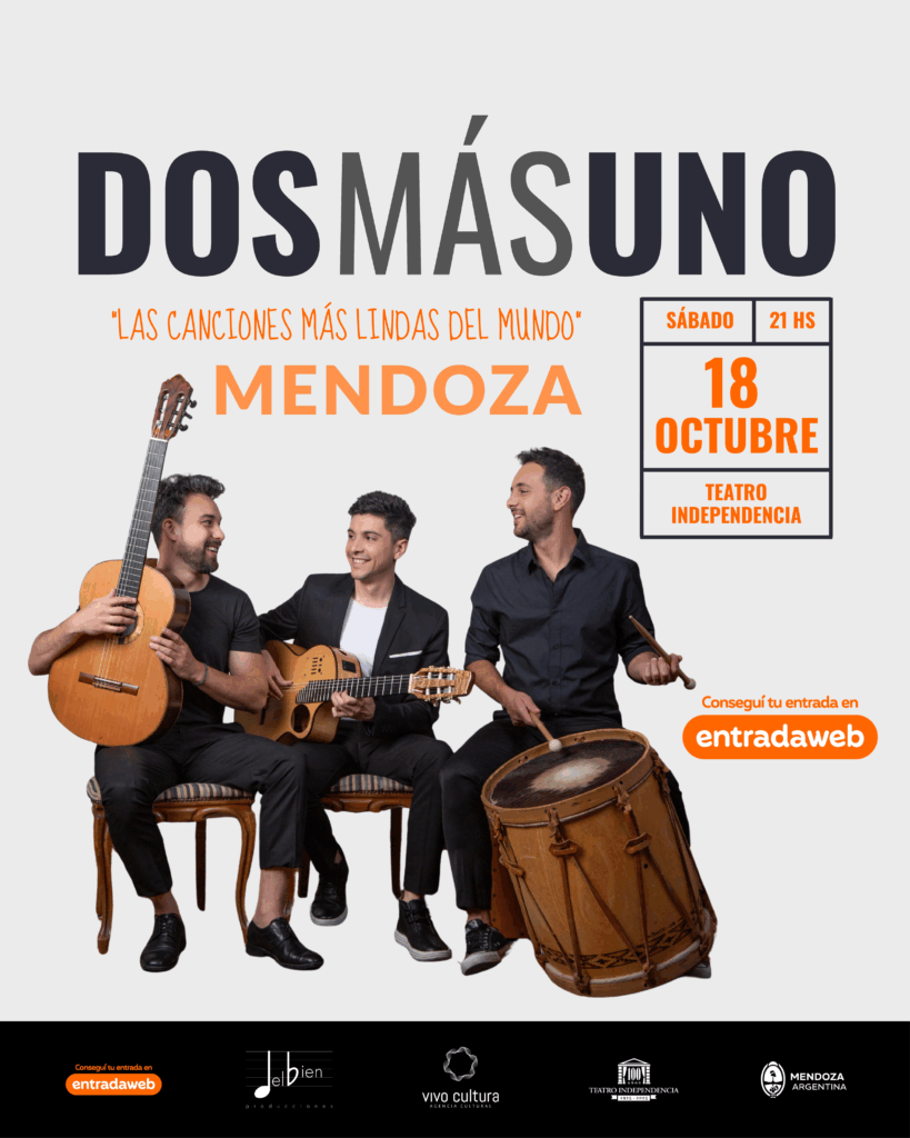 El sábado 18 de octubre en el Teatro Independencia se presenta Dos Más Uno (dosmasunotrio), el grupo argentino conformado por los destacados músicos Marcelo Dellamea, Hugo Dellamea y Ariel Sánchez. En su primer visita a Mendoza, presentarán “Las canciones más lindas del mundo”.