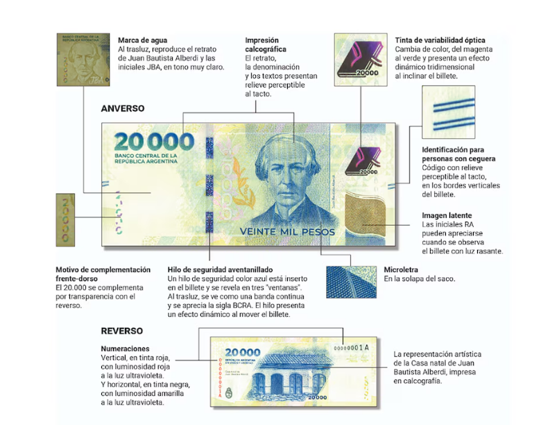 “Este billete completa la familia ‘Heroínas y Héroes de la Patria’ creada en 2022. El anverso del billete presenta la imagen de Juan Bautista Alberdi, inspirador de la Constitución Nacional de 1853. El reverso ilustra la recreación de la casa natal del abogado, escritor, periodista, filósofo, economista, diplomático y político argentino”, explicó la autoridad monetaria.