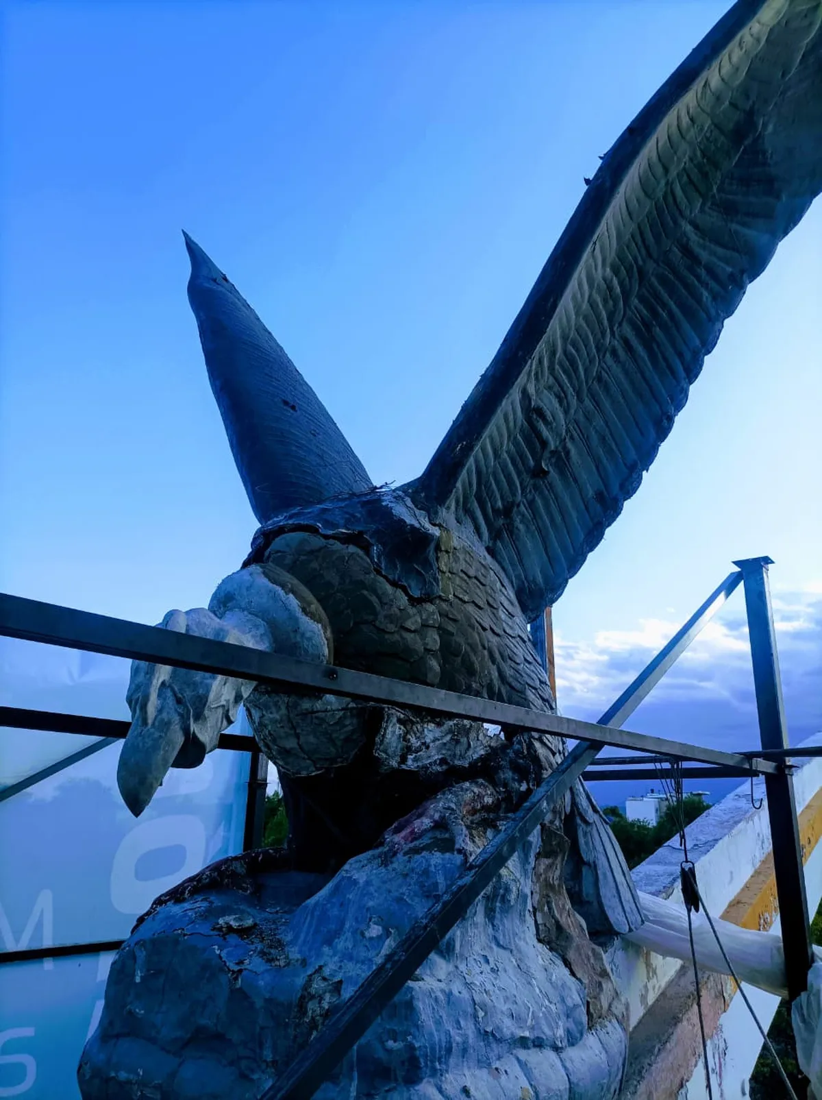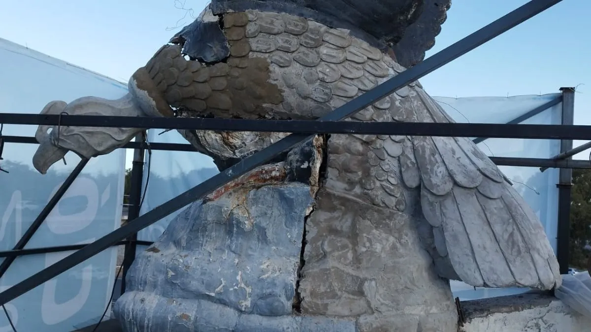 Catorce meses después de que una tormenta de viento y granizo decapitara la escultura del Cóndor del Acceso, la obra volvió a tener cabeza este martes.