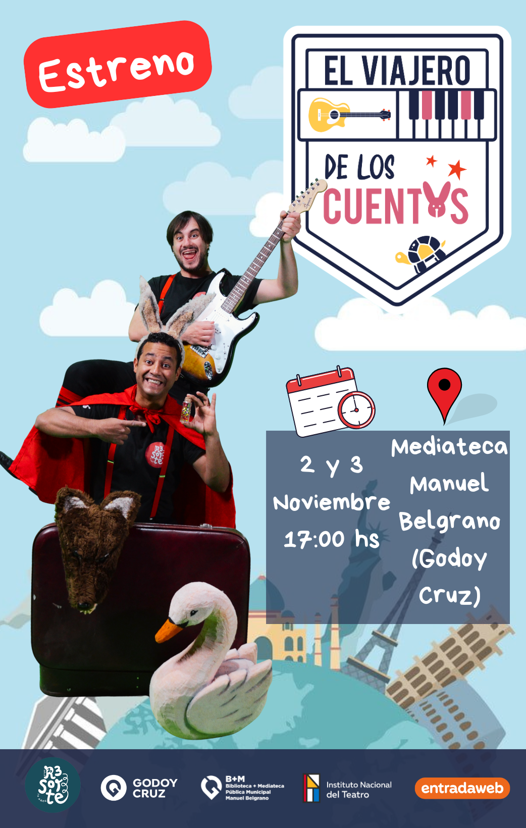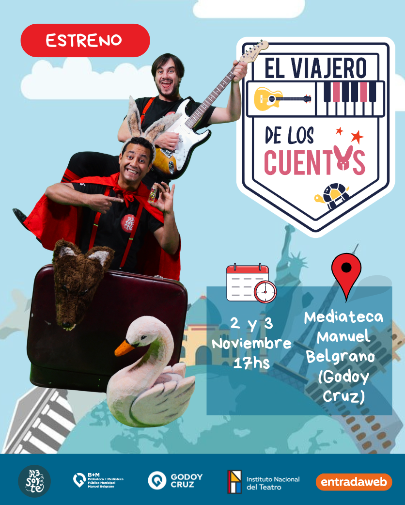 El elenco mendocino de teatro infantil «El Resorte» con más de 10 años de trayectoria, estrena su nueva obra «El viajero de los cuentos«, en la Mediateca Manuel Belgrano (Godoy Cruz) los días sábado 2 y domingo 3 de noviembre a las 17 hs. Las entradas ya están a la venta y se pueden adquirir en Entrada Web. Si realizas la compra anticipada podes acceder a diversas promos y descuentos: https://www.entradaweb.com.ar/evento/2d3cf16c/step/1