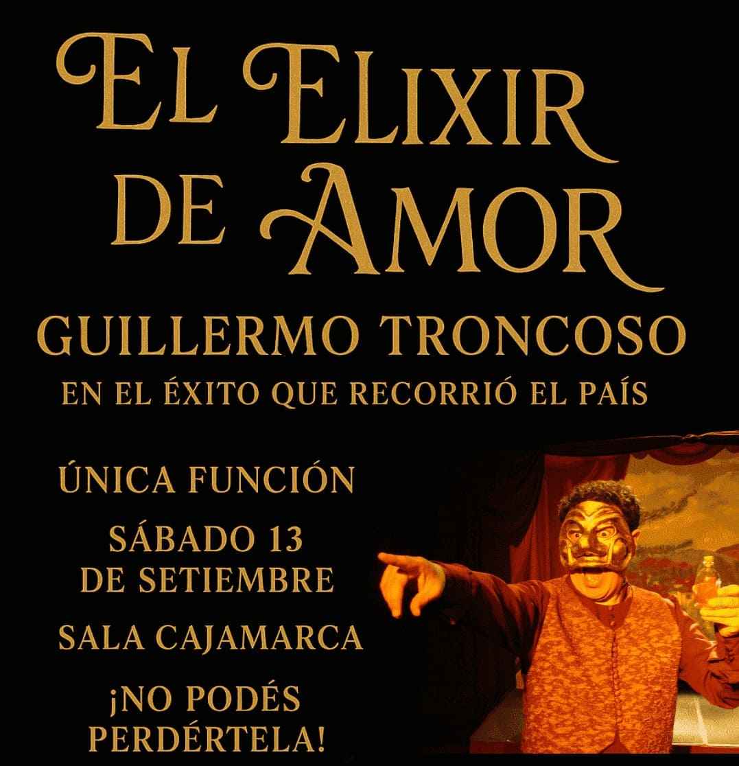 El actor y director teatral Guillermo Troncoso (guilletroncosoteatro) volverá a poner en escena su exitoso unipersonal “El elixir de amor”. Será una única presentación en Mendoza de la obra que recorrió el país cosechando un elogioso reconocimiento por parte del público y de la crítica especializada. La cita será el sábado 13 de septiembre, en Cajamarca Teatro. Las entradas para la función se pueden adquirir a través de EntradaWeb a un valor general de $10.000.