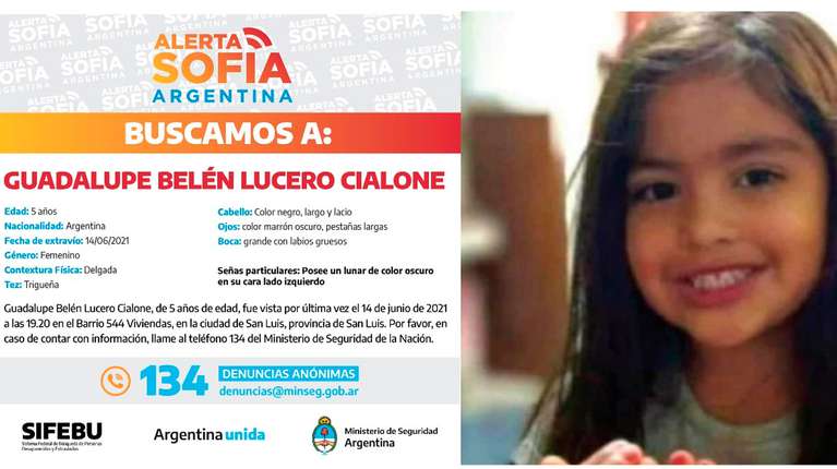 A través de la Resolución 289/2021, publicada este viernes en el Boletín Oficial, la ministra de Seguridad, Sabina Frederic, formalizó el ofrecimiento de una recompensa de 2 millones de pesos «para aquellas personas que brinden datos útiles que permitan dar con el paradero de Guadalupe Belén Lucero Cialone».