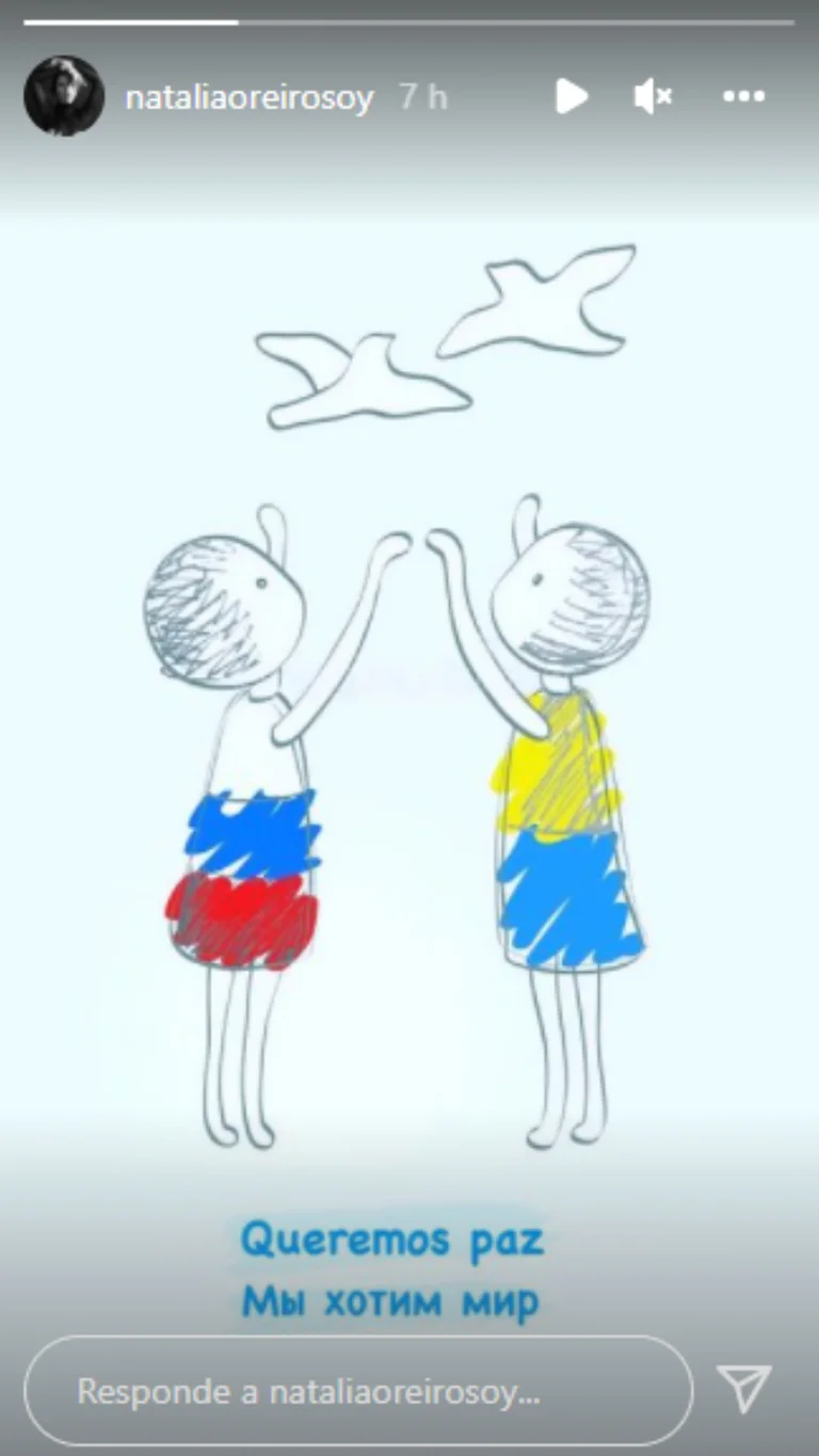 En este contexto, en las últimas horas la ex Muñeca Brava decidió romper el silencio a través de su cuenta de Instagram. En sus stories, publicó una caricatura en la que se ven dos personas, una con los colores de la bandera de Rusia y otra con los de Ucrania, y ambas tratando de alcanzar dos palomas. “Queremos paz”, se puede leer, tanto en idioma ruso como en español.