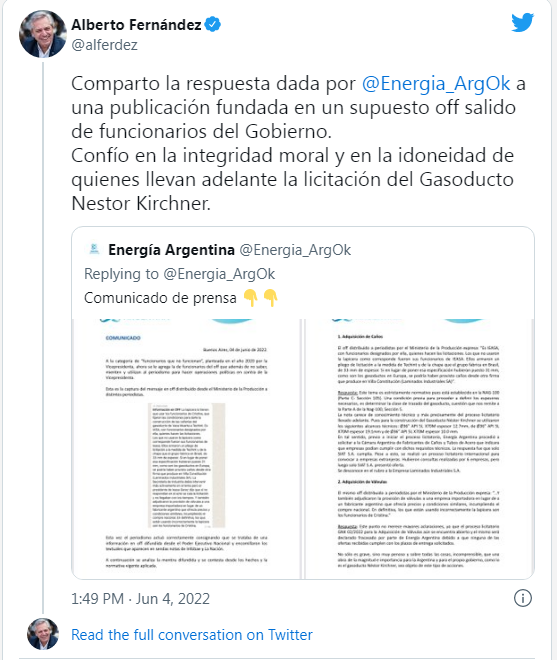 Por su parte, Alberto Fernández dijo compartir el malestar expresado por la vicepresidenta y expresó: “Comparto la respuesta dada por Energía Argentina a una publicación fundada en un supuesto off salido de funcionarios del Gobierno. Confío en la integridad moral y en la idoneidad de quienes llevan adelante la licitación del Gasoducto Nestor Kirchner”.