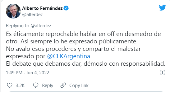 “Es éticamente reprochable hablar en off en desmedro de otro. Así siempre lo he expresado públicamente. No avalo esos procederes y comparto el malestar expresado por Cristina Fernández de Kirchner. El debate que debamos dar, démoslo con responsabilidad”, agregó.