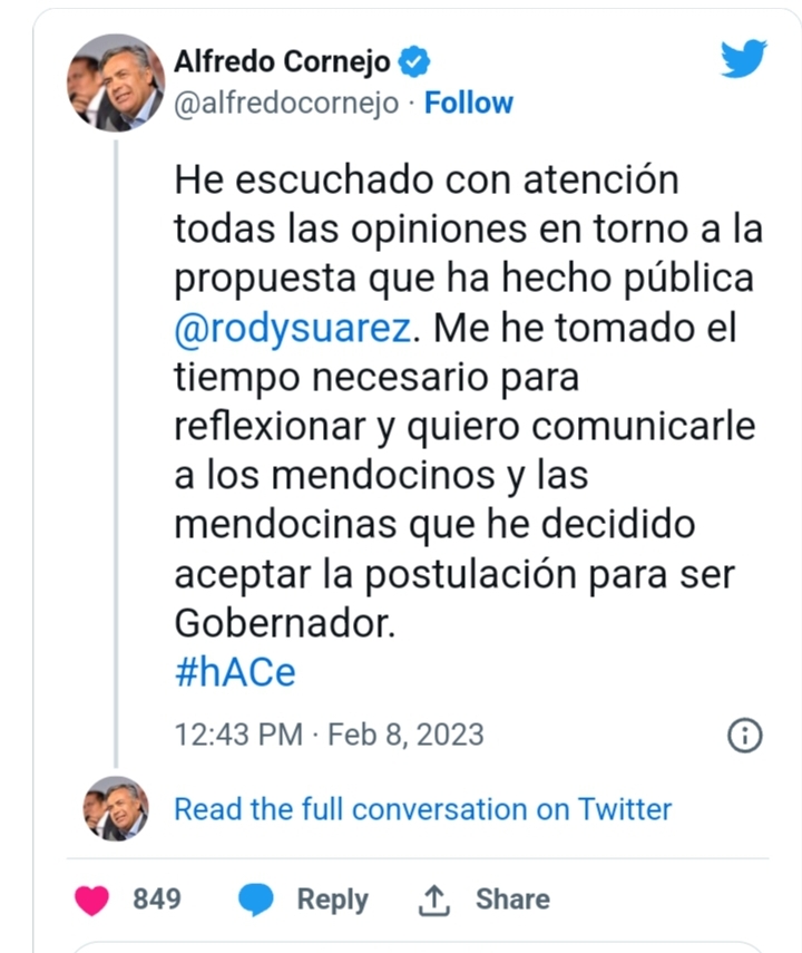 “He escuchado con atención todas las opiniones en torno a la propuesta que ha hecho pública @rodysuarez. Me he tomado el tiempo necesario para reflexionar y quiero comunicarle a las mendocinos y mendocinos que he decidido aceptar la postulación para ser Gobernador”, anunció en un extenso hilo, donde lanzó críticas al kirchnerismo, planteó ejes de campaña y también dejó un mensaje para Omar De Marchi.