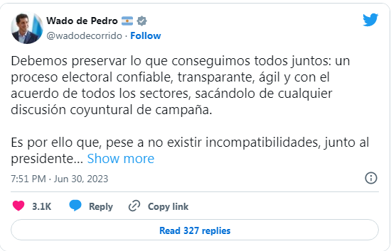 De Pedro había afirmado que su precandidatura a senador nacional por Unión por la Patria «no presenta incompatibilidad alguna con su función», a pesar de lo cual propuso el traslado de la DINE fuera de su esfera, indicaron fuentes del Ministerio del Interior. «Debemos preservar lo que conseguimos todos juntos, un proceso electoral confiable, transparente, ágil y con el acuerdo de todos los sectores, sacándolo de cualquier discusión coyuntural de campaña», afirmó De Pedro.