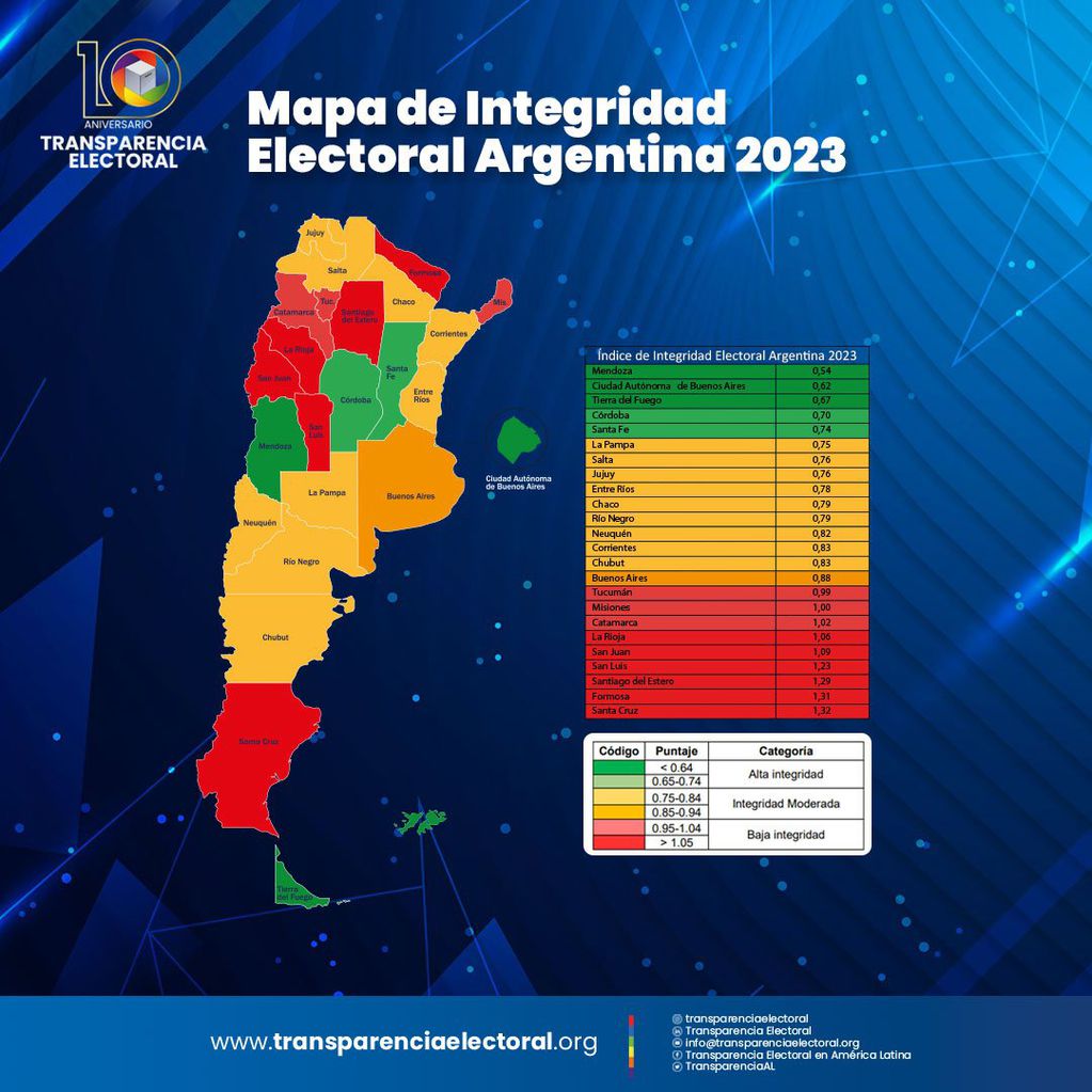Una vez recopilada y sistematizada la información, estos indicadores producen el “Índice de Integridad Electoral Argentina”, en el que cada provincia obtiene un puntaje que a su vez es producto del promedio de todos los indicadores, pudiendo llegar del 0.00 al 2.00, donde 0.00 es el mejor puntaje y 2.00 el peor. Cada provincia se clasifica según el puntaje obtenido en las siguientes categorías: integridad electoral baja, moderada o alta.