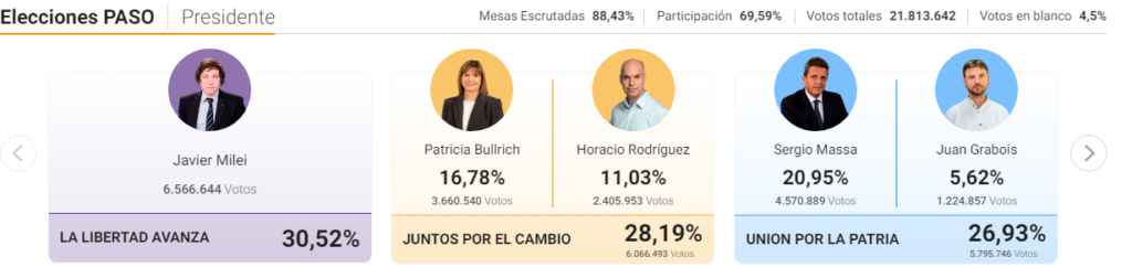 Los resultados del escrutinio provisorio, con casi el 90% de las mesas escrutadas, confirmaron las versiones que ya habían comenzado a circular desde el cierre de mesas: Javier Milei, el líder de La Libertad Avanza, se impone como el candidato presidencial más votado con el 30,52%. Los contundentes datos sacudieron al mundo político y anticipan una transformación radical del escenario electoral de cara a octubre.