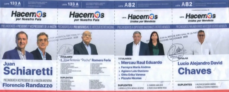 El precandidato a presidente de Hacemos por nuestro país (Lista 133 A)es Juan Schiaretti, quien elegió como compañero de fórmula a Florencio Randazzo. En tanto, los precandidatos a diputados nacionales por Mendoza son Raúl Mercau y María Andrea Ferreyra en primero y segundo término. Mientras que como precandidato a parlamentario del Mercosur, el representante es Lucio Chaves.