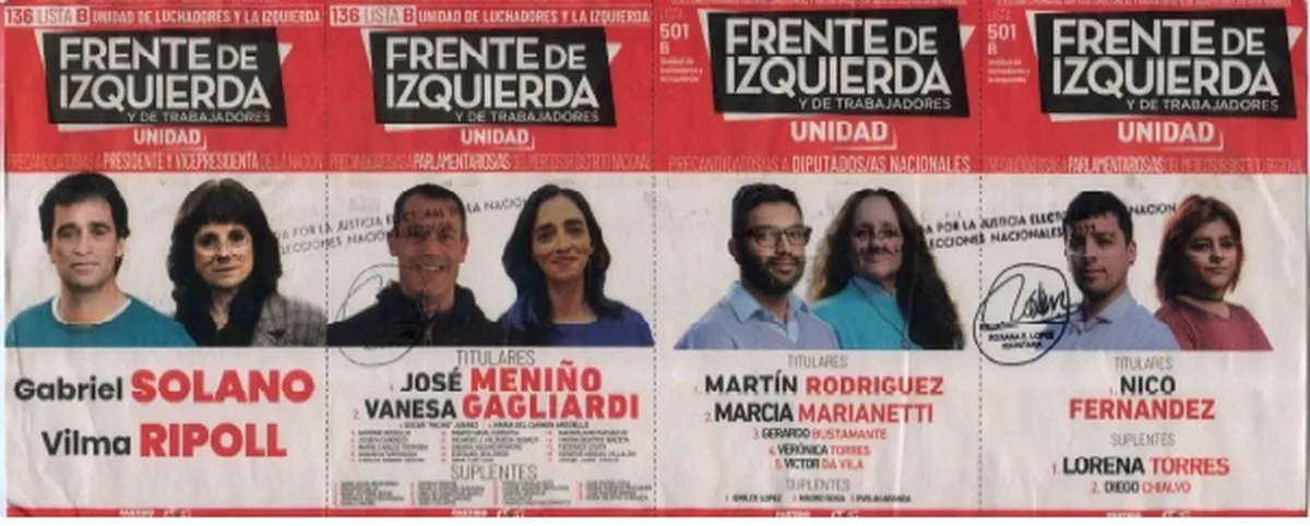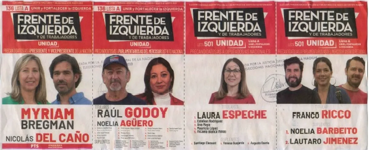 Por el Frente de Izquierda Unidad, hay dos listas para precandidatos a presidenta y vice: la de Myriam Bregman y Nicolás del Caño es la 136 A. En esta lista, la precandidatura a diputada nacional en primer término es para Laura Espeche y como parlamentario del Mercosur el elegido es Franco Ricco.