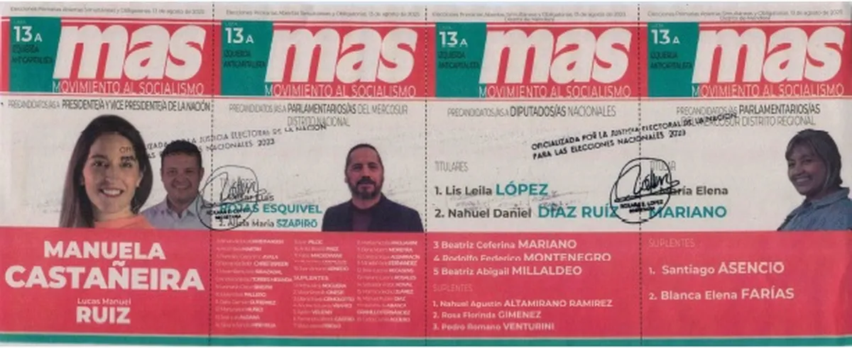 Las propuestas del MAS (Lista 13 A) son en la precandidatura a presidenta, Manuela Castañeira, y en la precandidatura a vicepresidente, Lucas Ruiz. En la precandidatura a diputados nacionales, encabezan la lista Lis López y Nahuel Díaz Ruiz, y como precandidata a parlamentaria del Mercosur, la precandidata es María Elena Mariano.