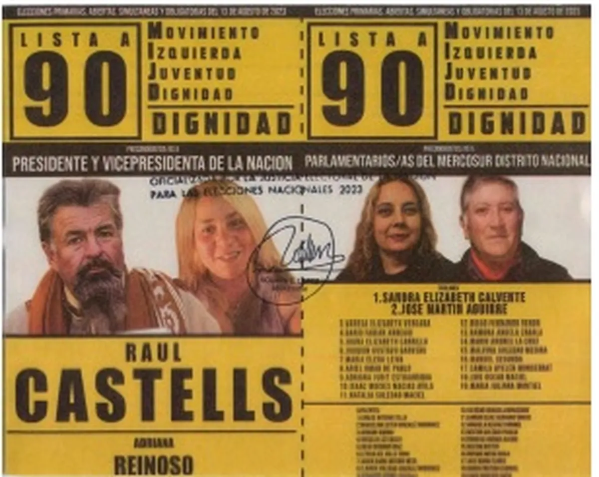 La lista 90 A del Movimiento de Izquierda Juventud Dignidad lo propone a Raúl Castells como precandidato a presidente y a Adriana Reinoso como precandidata a vicepresidenta.