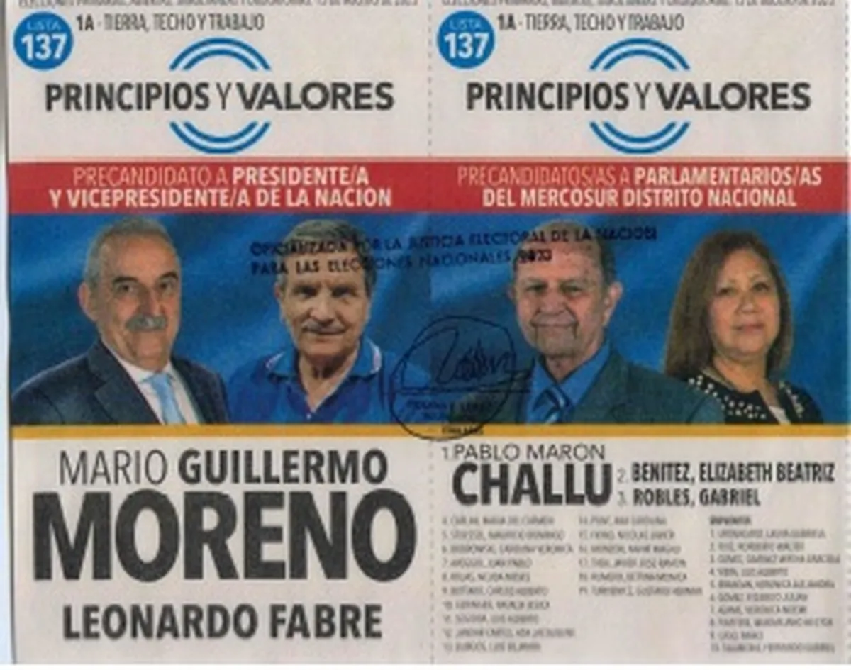 Guillermo Moreno, el reconocido funcionario de Néstor Kirchner, es el precandidato a presidente por el partido Principios y Valores (lista 137). Mientras que Leonardo Fabre es el precandidato a vicepresidente. En Mendoza van con boleta corta.