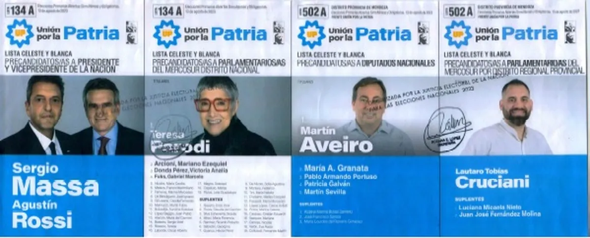El Frente Justicialista Unión por la Patria presenta dos fórmulas presidenciales: la 134 A, que lleva a Sergio Massa como precandidato a presidente y a Agustín Rossi como precandidato a vicepresidente.