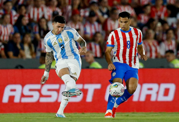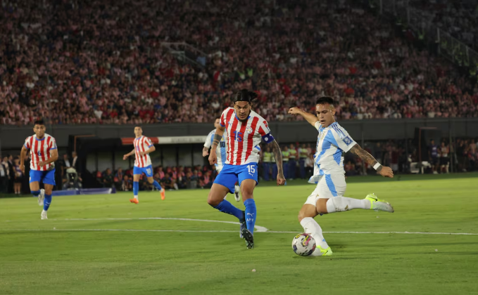 En el comienzo, el esquema táctico de Scaloni sorprendió alejándose del 4-3-3 con Lautaro y Julián de punta, para pasar a un 4-4-2 con Álvarez comenzando casi como volante por izquierda. Argentina dominó la pelota, y no mostró apuro en filtrar pases. Paraguay se paró en un bloque corto, y peleó cada dividida como si fuese la última.