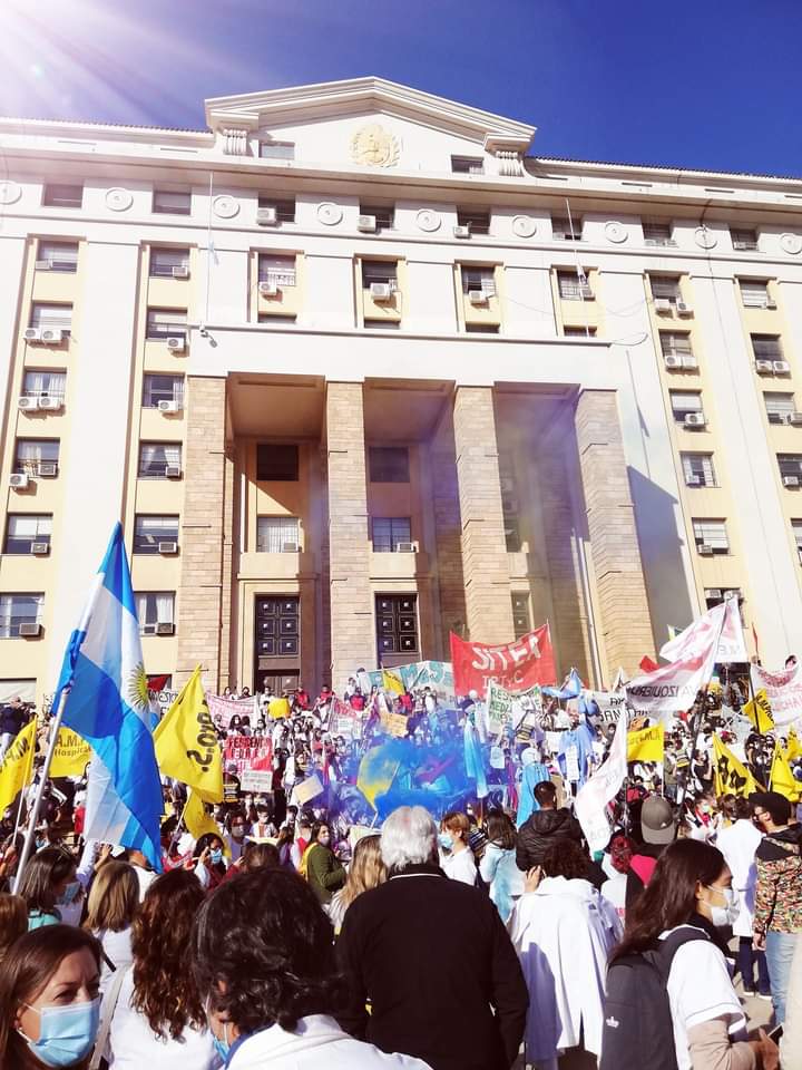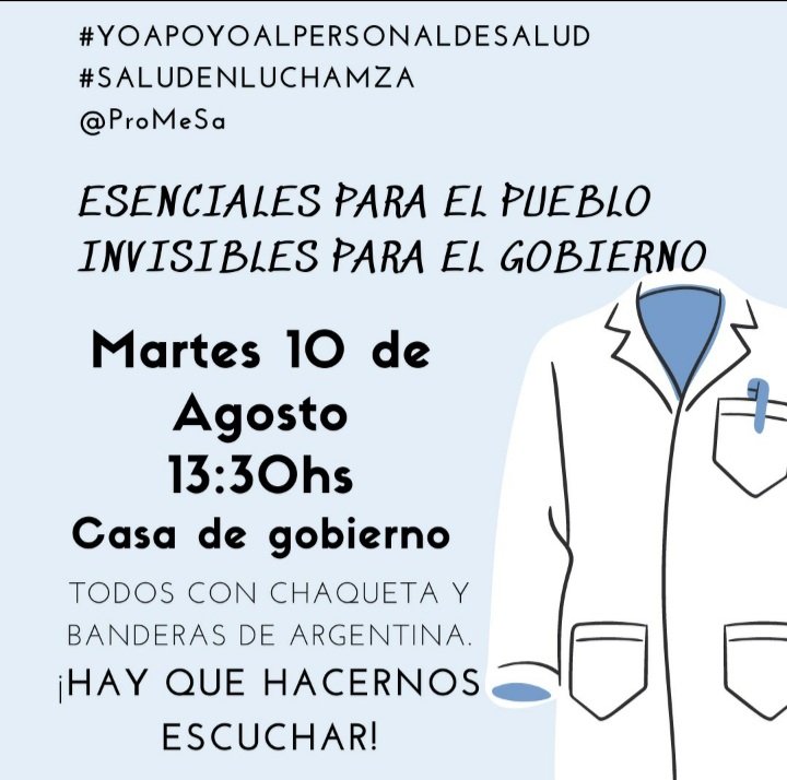 En el mismo horario se han convocado los profesionales de la salud a Casa de Gobierno con sus guardapolvos blanco con la idea de ser escuchados y dejar de ser invisibles para el gobierno.