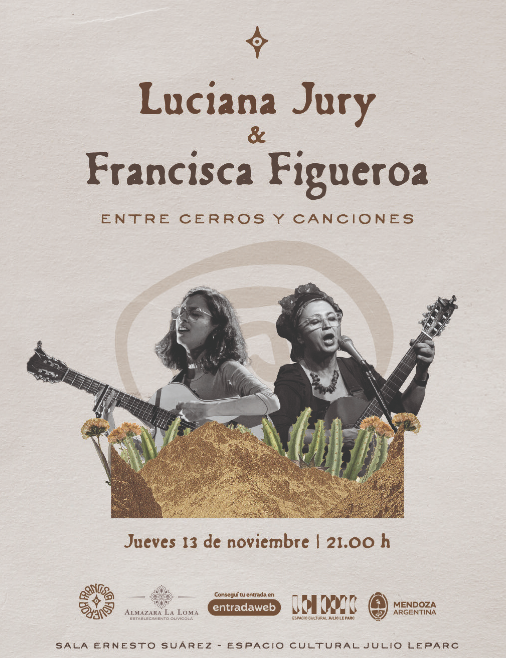 «Entre Cerros y Canciones» es un ciclo creado y curado por la cantautora mendocina Francisca Figueroa (franciscafigueroamusica) y en la próxima edición da la bienvenida a la voz telúrica y visceral de Luciana Jury (lucianajuryoficial), el jueves 13 de noviembre en el Espacio Cultural Julio Le Parc a las 21 horas. Entradas – Juntas, desplegarán un concierto donde las canciones serán el puente entre voces, territorios y públicos.